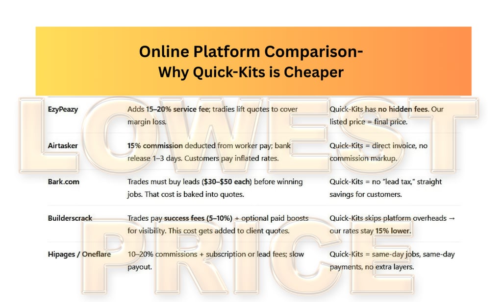 Guarantee “Quick-Kits guarantees to be at least 15% cheaper than any registered assembly service in Auckland or Waikato. Show us a lower published rate and we’ll match or beat it.”